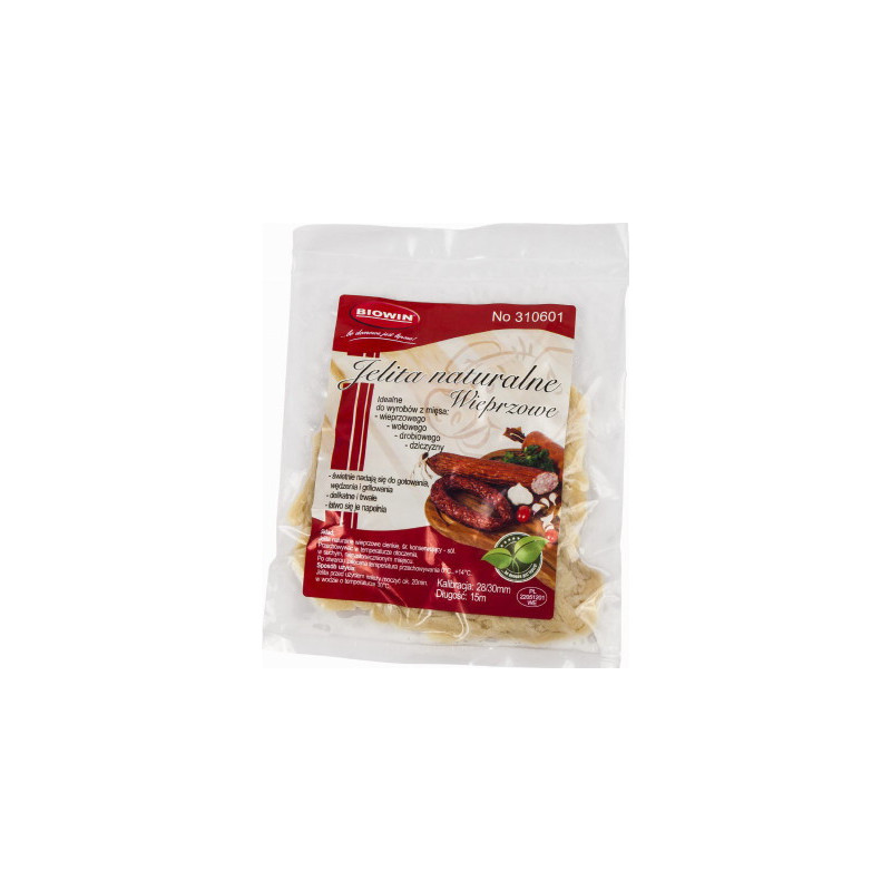 Jelita naturalne wieprzowe w kalibracji 28/30 mm. Kaliber jelit dobiera się w zależności od gatunku i rodzaju kiełbasy. Konserwowane solą.