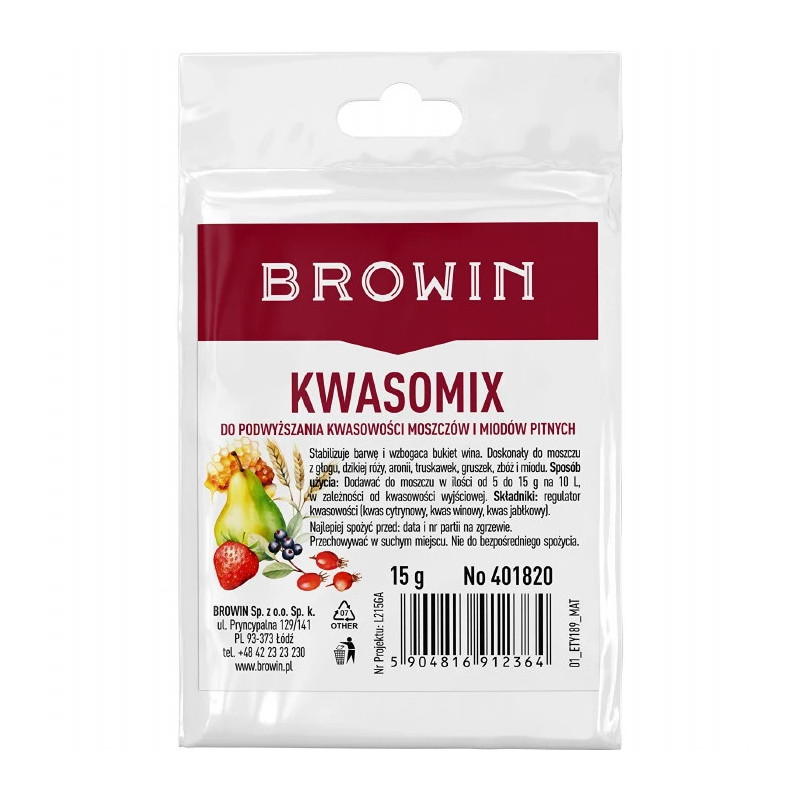 Idealnym rozwiązaniem przy małych nastawach jest dodanie Kwasomixu, czyli mieszaniny kwasów: winowego, jabłkowego i cytrynowego. Kompozycja występująca naturalnie w owocach.Doskonały do win z głogu, dzikiej róży, aronii, truskawek, gruszek, zbóż i miodów pitnych.Istotne cechy: